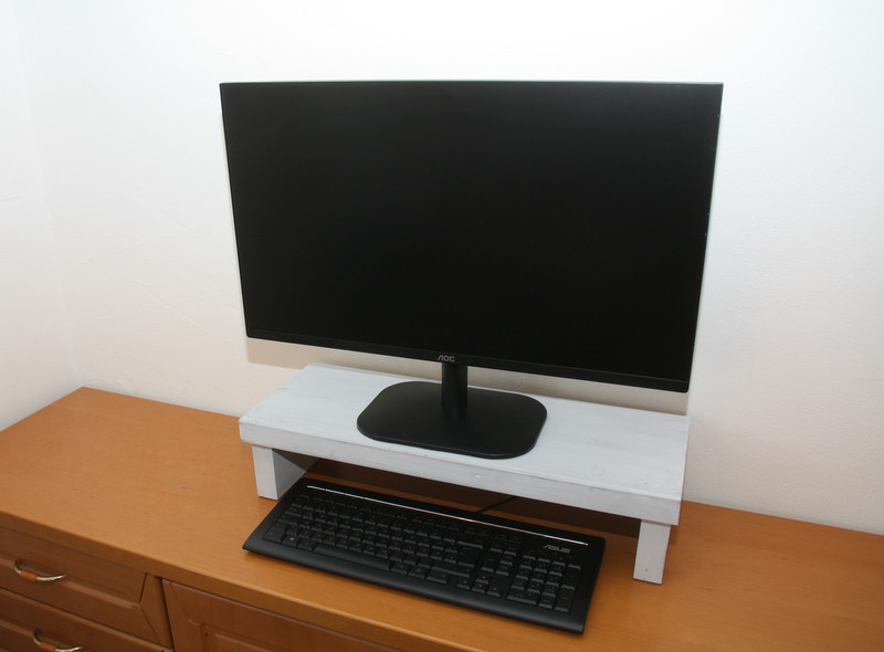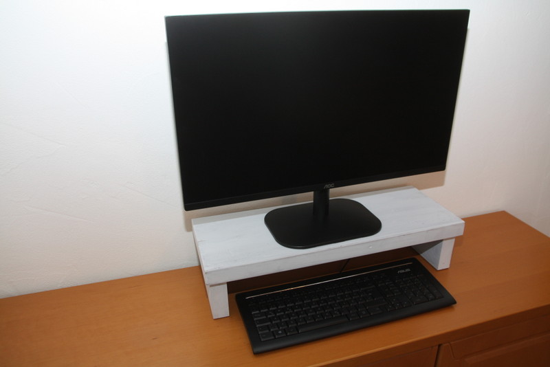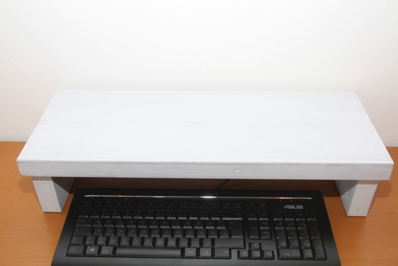 Diese Monitorerhöhung wurde aus 35 mm starkem, verleimten Kiefern- und Lärchenholz gefertigt. Nach zweimaligen Streichen wurde die Oberfläche im Vintagelook vollendet.